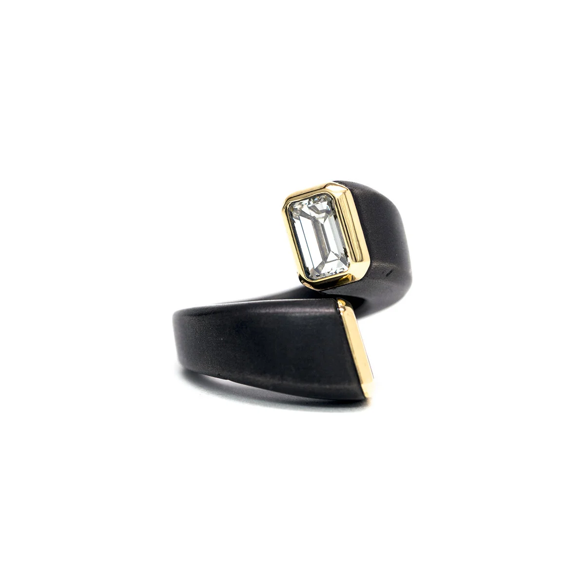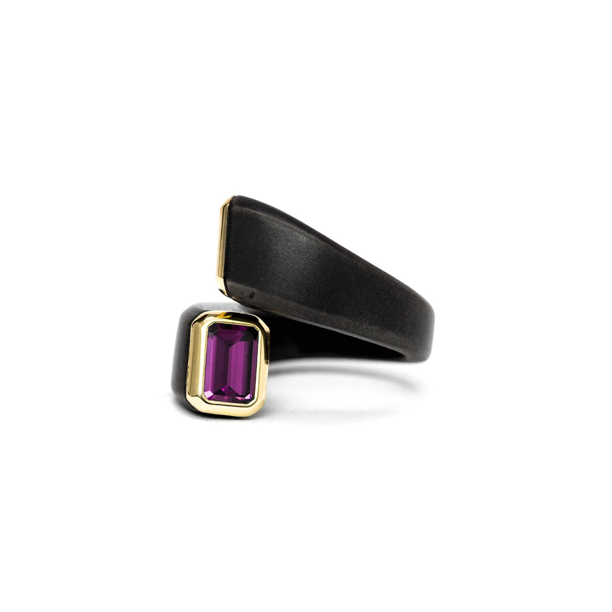 “MOI ET MOI” RING BLACKENED STERLING SILVER, 18K yellow GOLD, 2.4 CARAT EMERALD CUT DIAMOND, PRECISION MATCHED, MOZAMBIQUE GARNET
